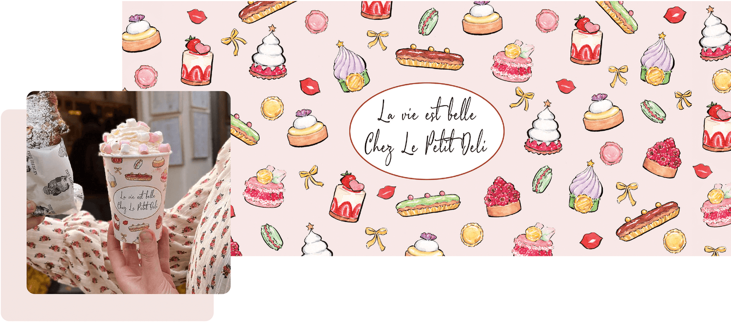 De bekers van Le Petit Deli zijn prachtig versierd met handgetekende illustraties van hun eigen gemaakte gebakjes. Ieder ontwerp is uniek en ademt een Franse sfeer.