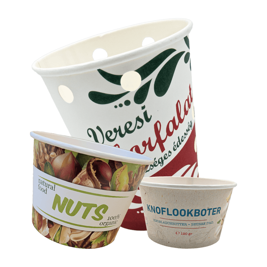 Alle buckets zijn gemaakt van stevig, EU-conform karton, verkrijgbaar in wit glanzend en kraft. Vetafstotend, geschikt voor warme én koude gerechten.